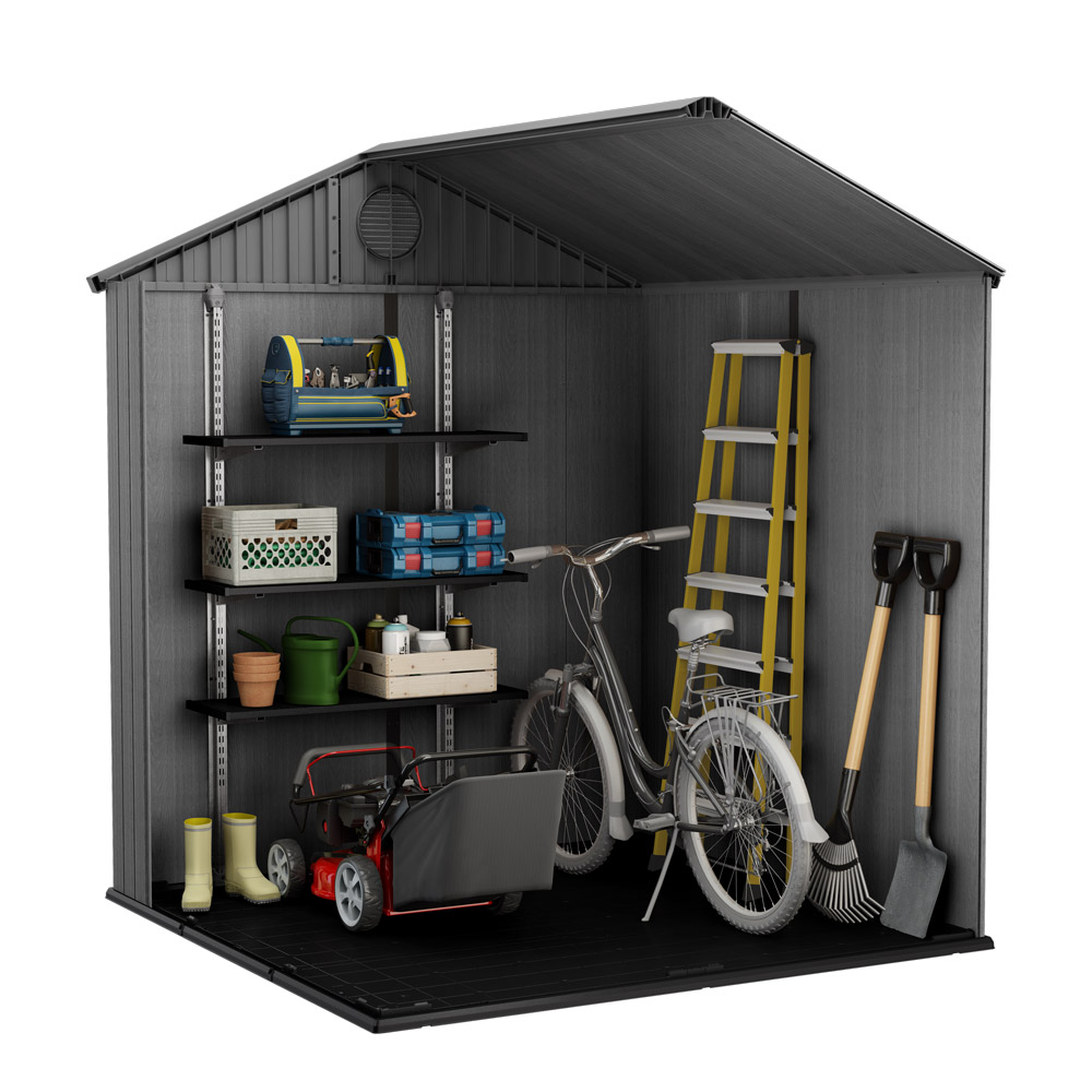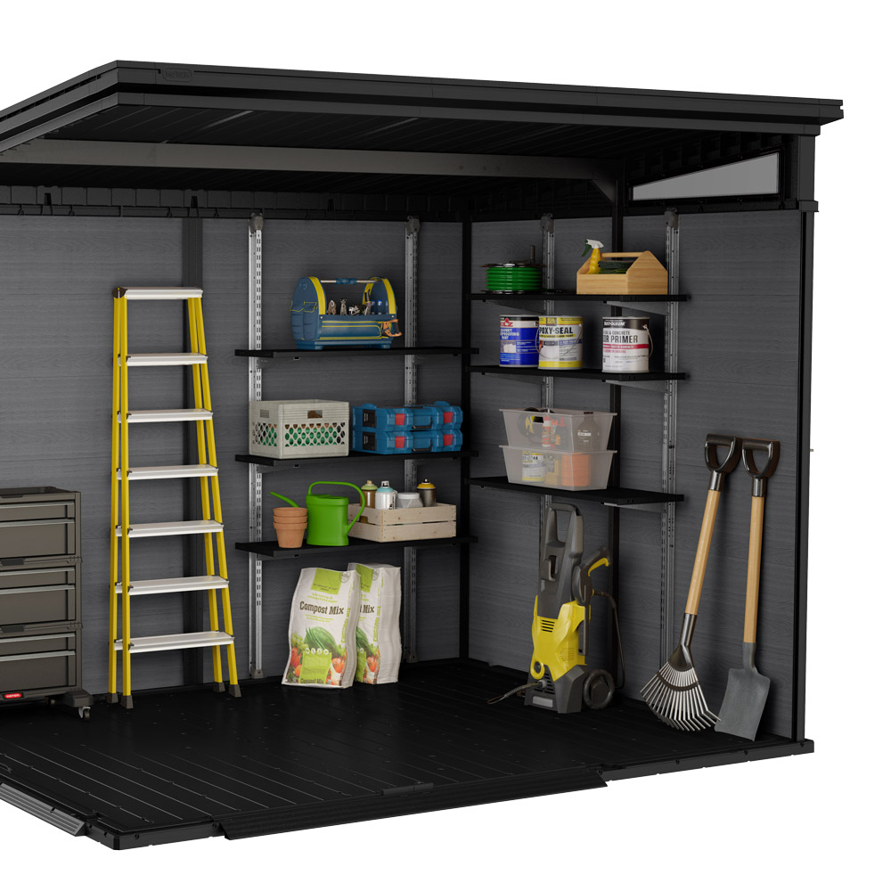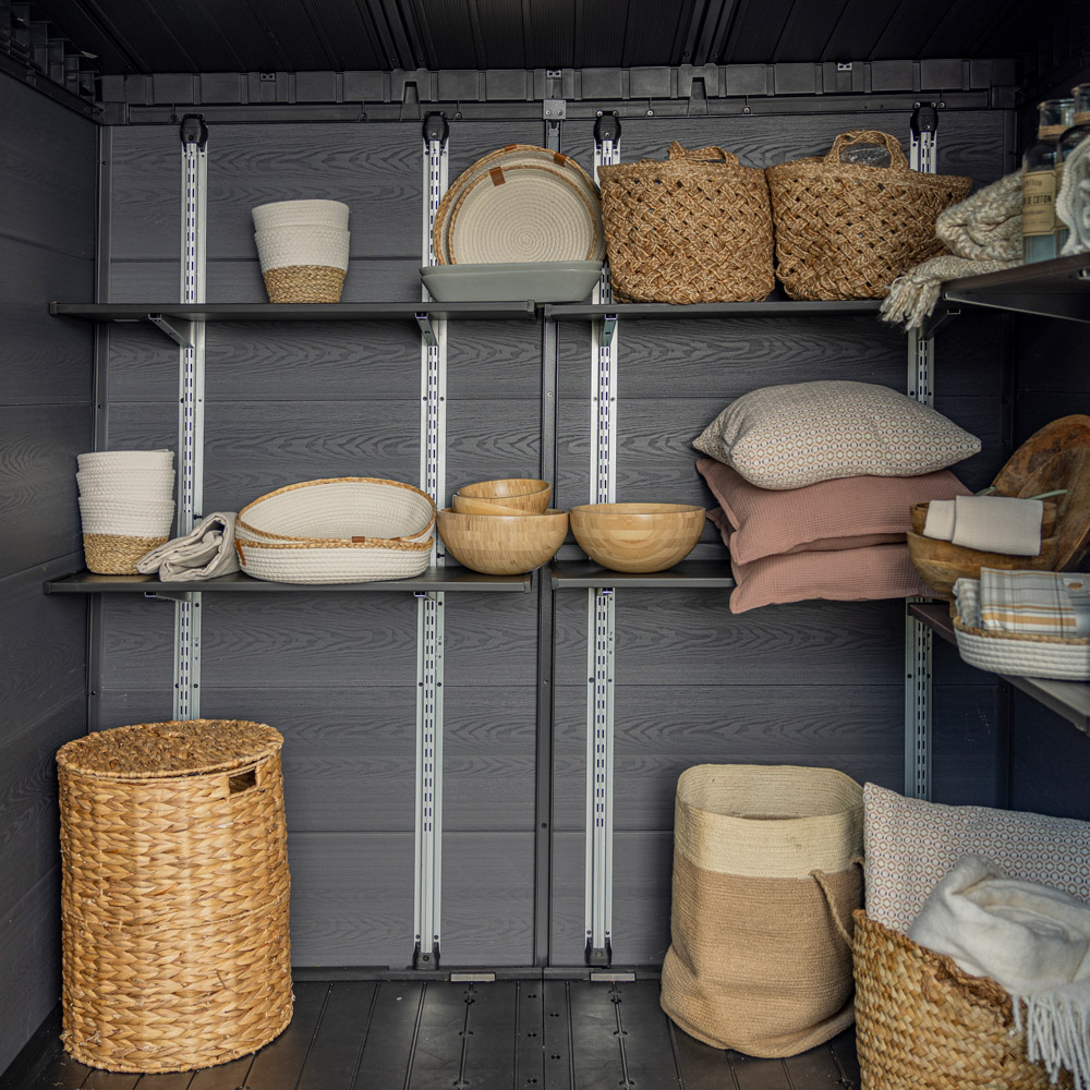 Hyllene er laget av slitesterk resin og forsterket med metall for ekstra stabilitet. Hver hylle tåler en belastning på opptil 30 kg, noe som gjør dem perfekte for oppbevaring av kasser, verktøy, hageutstyr og sesongartikler.