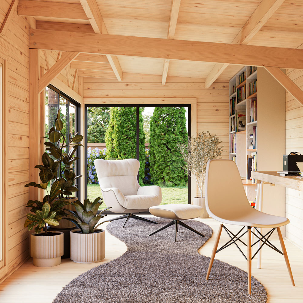 Andrea 22,1 m² Slide er en romslig og moderne kombinasjon av en stor, lys hovedstue og et praktisk sidebod på 4 m². Den brede glassfasaden med skyvedører i aluminium gir et åpent og luftig inntrykk som passer perfekt som hjemmekontor, atelier, gjesterom eller et større uterom. Boden gir smart og adskilt lagringsplass for verktøy, sykler og hageutstyr.