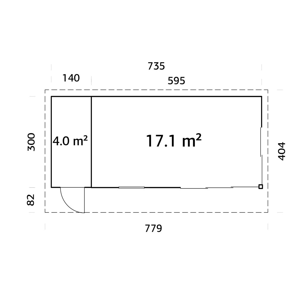 Andrea 22,1 m² Slide Plus er en romslig og moderne hagebygning med store skyvedører i aluminium og isolerende dobbeltglass. Den brede glassfasaden slipper inn rikelig med lys og skaper et åpent rom som passer utmerket som gjesterom, atelier, hjemmekontor eller et større uterom. Det separate bodrommet på 4 m² gir praktisk lagringsplass for verktøy, sykler og hageutstyr.