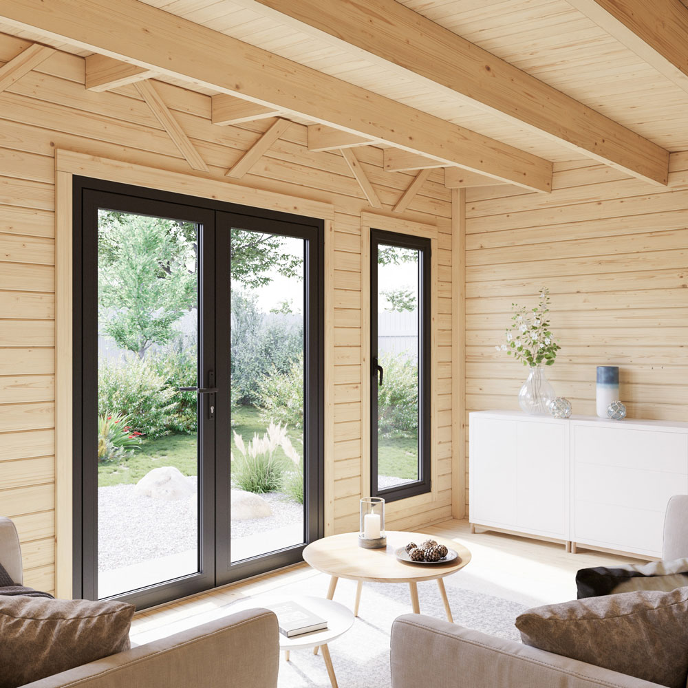 Aurelia 12,7 m² leveres med en stor glasset dobbeldør med åpning 147×191 cm og et høyt sidevindu på 56×164 cm, plassert i henhold til plantegningen.