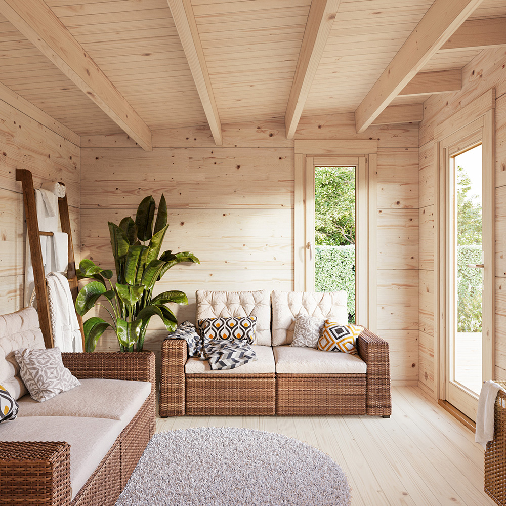 Ubehandlet tre (med unntak av grunnsøyler) blir gråaktig etter å ha vært ubeskyttet en stund, og kan bli blått og begynne å mugne. For å beskytte tredetaljer på hagehuset ditt, må du umiddelbart behandle dem med trebeskyttelsesmiddel. Vi anbefaler at du på forhånd behandler gulvbordene med et fargeløst treimpregneringsmiddel, spesielt på undersiden av bordene som du ikke får tilgang til etter at huset er montert. Dette er den eneste måten å forhindre fuktinntrenging på.