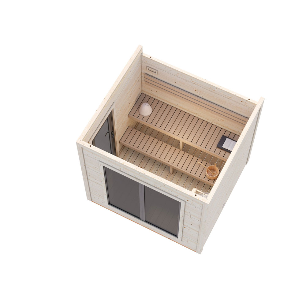 Bygget er laget i 56 mm laftet nordisk gran, noe som gir høy stabilitet og god varmelagring. Veggmålet er 250×230 cm, vegghøyden 245 cm og total høyde 249 cm. Taket har en helning på 2° og en toplam på 5,8 m². Takbord leveres i 19 mm, og gulvbord i 28 mm for ekstra styrke. Den kompakte volumet på 12,1 m³ gjør at badstuen raskt når ønsket temperatur.
