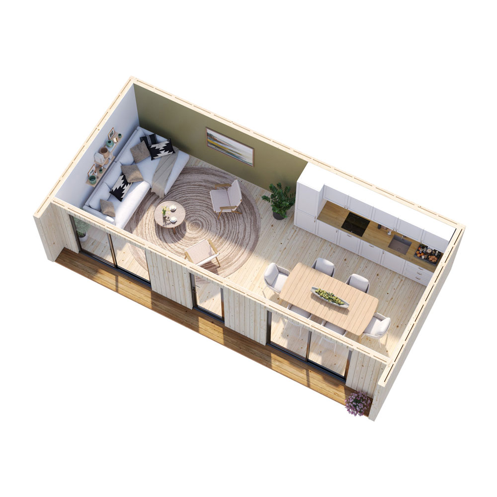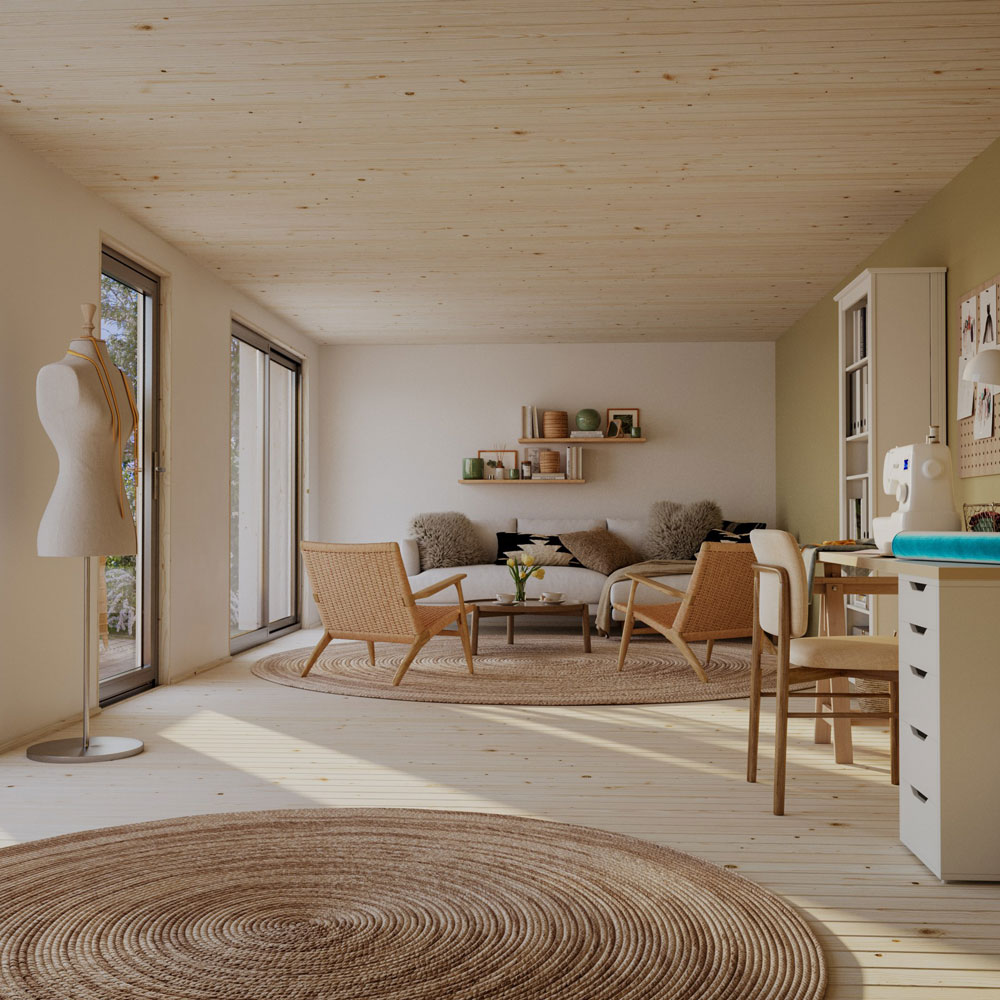Rebekka 41 m² er den største modellen i serien og gir et imponerende, lyst og moderne uterom med god takhøyde og tydelig arkitektonisk karakter. Det bratte saltaket på 20° og de store glassdørene skaper en romslig og åpen atmosfære, perfekt som hagekontor, atelier, gjesterom eller et ekstra oppholdsrom.
