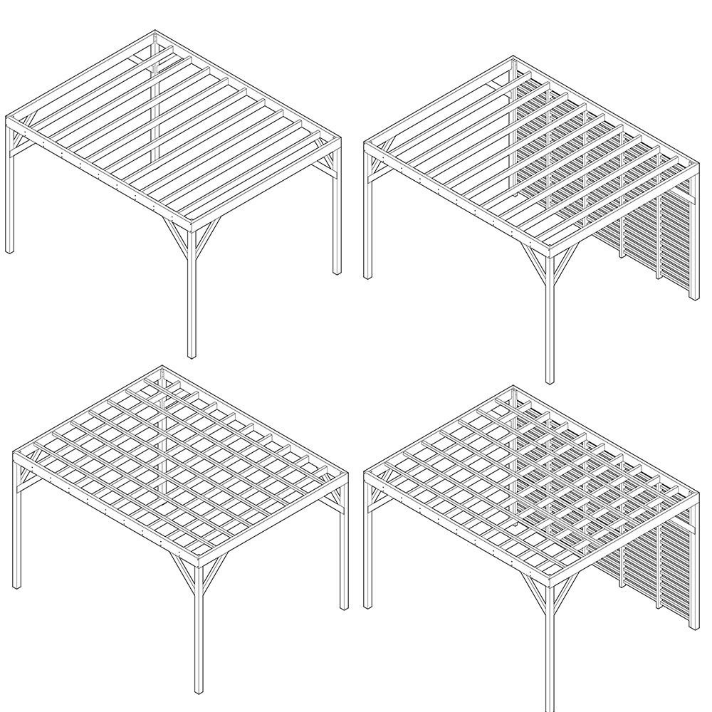 Ønsker du mer skygge og en annen utforming av taket, kan du velge et stilfullt spiletak. Pergolaens tak får da et rutemønster. Spiletaket leveres ferdigkappet og malt i samme farge som pergolaen.