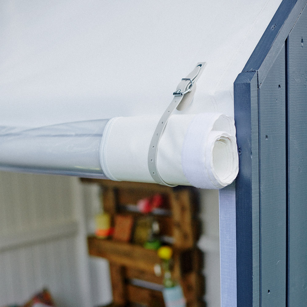 Den solide trekonstruksjonen kombineres med en kraftig, vevd polyesterduk som beskytter mot vind og lett regn. Duken kan rulles opp med glidelås i midten, slik at du enkelt kan åpne eller lukke etter behov.