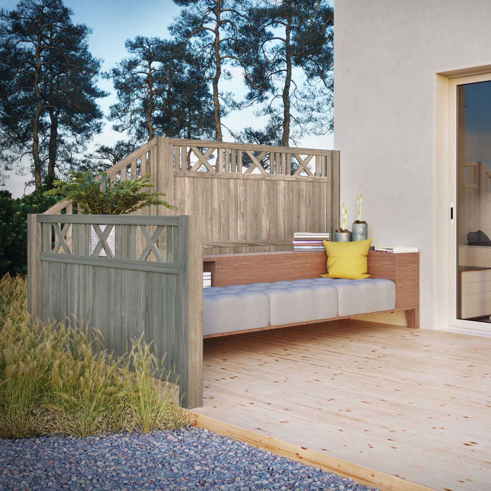 Skjerm i nordisk gran med klassisk kryssdekor i øvre del. Du får en lys og luftig avgrensning som passer ved terrasse, uteplass og hageganger. Kombiner den med øvrige deler i Karina-serien for en helhetlig løsning.