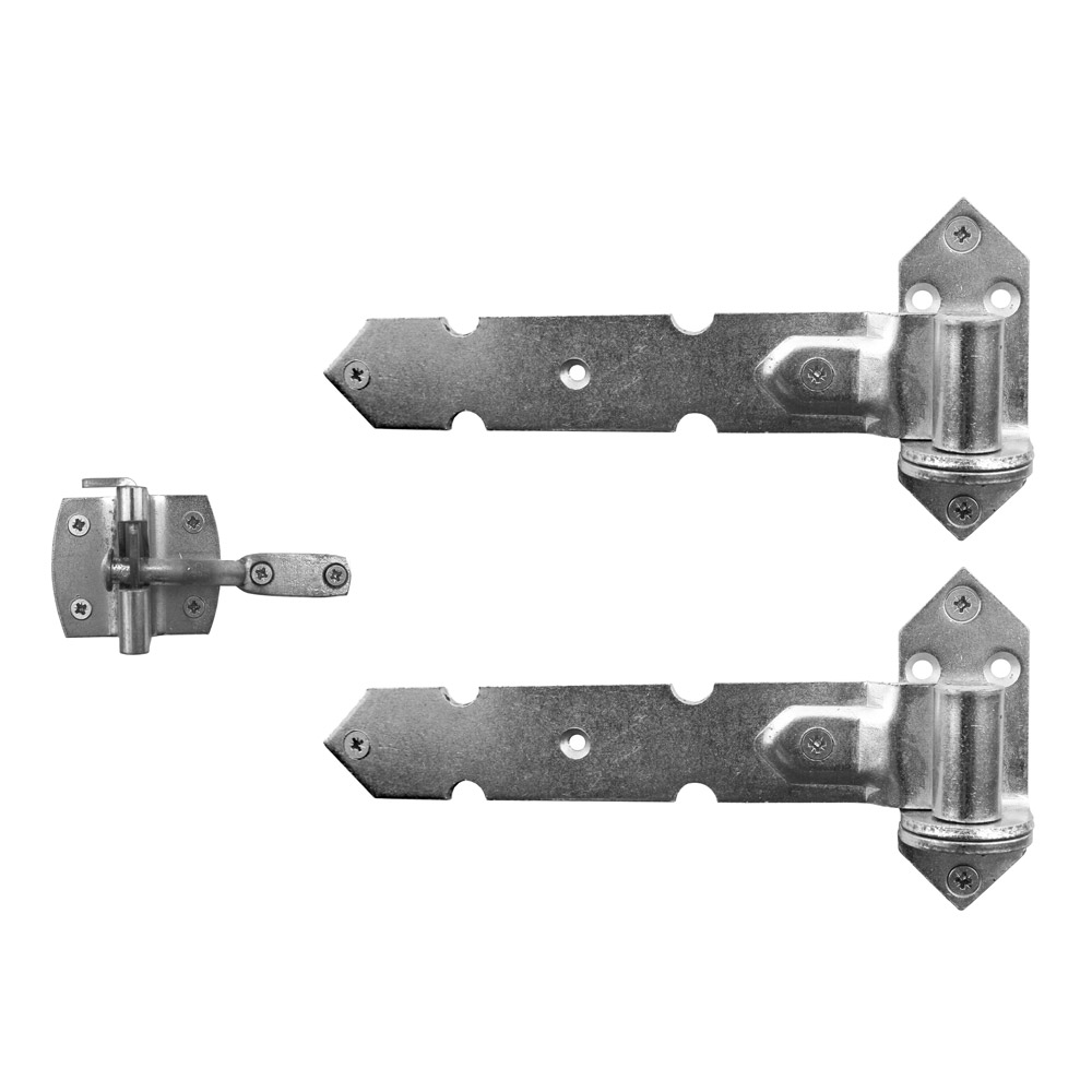 Beslagsett med hengsler og fester for montering av hageport. Du får en stabil og sikker opphenging som gjør at porten åpner og lukker lett.