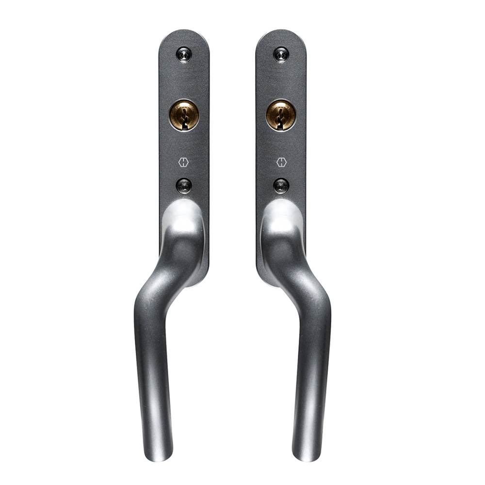 Velger du dobbelspanjolett, får du håndtak på begge dørene. Dobbelspanjoletten har håndtak med sylinder på dørens innside og håndtak på dørens utside. Du kan dermed låse og låse opp døren fra innsiden.